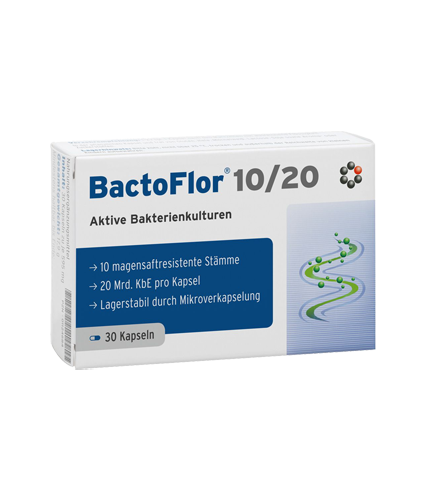 Dzięki wykorzystaniu w preparacie BactoFlor®10/20 mocno skondensowanego kompleksu dziesięciu różnych kultur bakterii w sposób bardzo skuteczny możemy wzmocnić mikroflorę jelit naszego organizmu. BactoFlor®10/20 jest efektywny w przypadku dużego zapotrzebowania oraz konieczności szybkiego uzupełnienia mikroflory w bakterie probiotyczne.