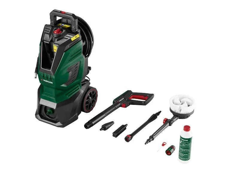 - Zawarte akcesoria: 1x pistolet, 1x lanca, 1x dysza standardowa, 1x turbodysza do usuwania brudu, 1x pistolet pianowy, 1x obrotowa szczotka myjąca z przegubem, 1x igła do czyszczenia dysz, 1x przyłącze wody z sitkiem (wstępnie zmontowane), 1x szybkozłączka z adapterem do węża ogrodowego, ok. 10 m węża wysokociśnieniowego, 1x butelka środka czyszczącego 500 ml (Made in Germany)